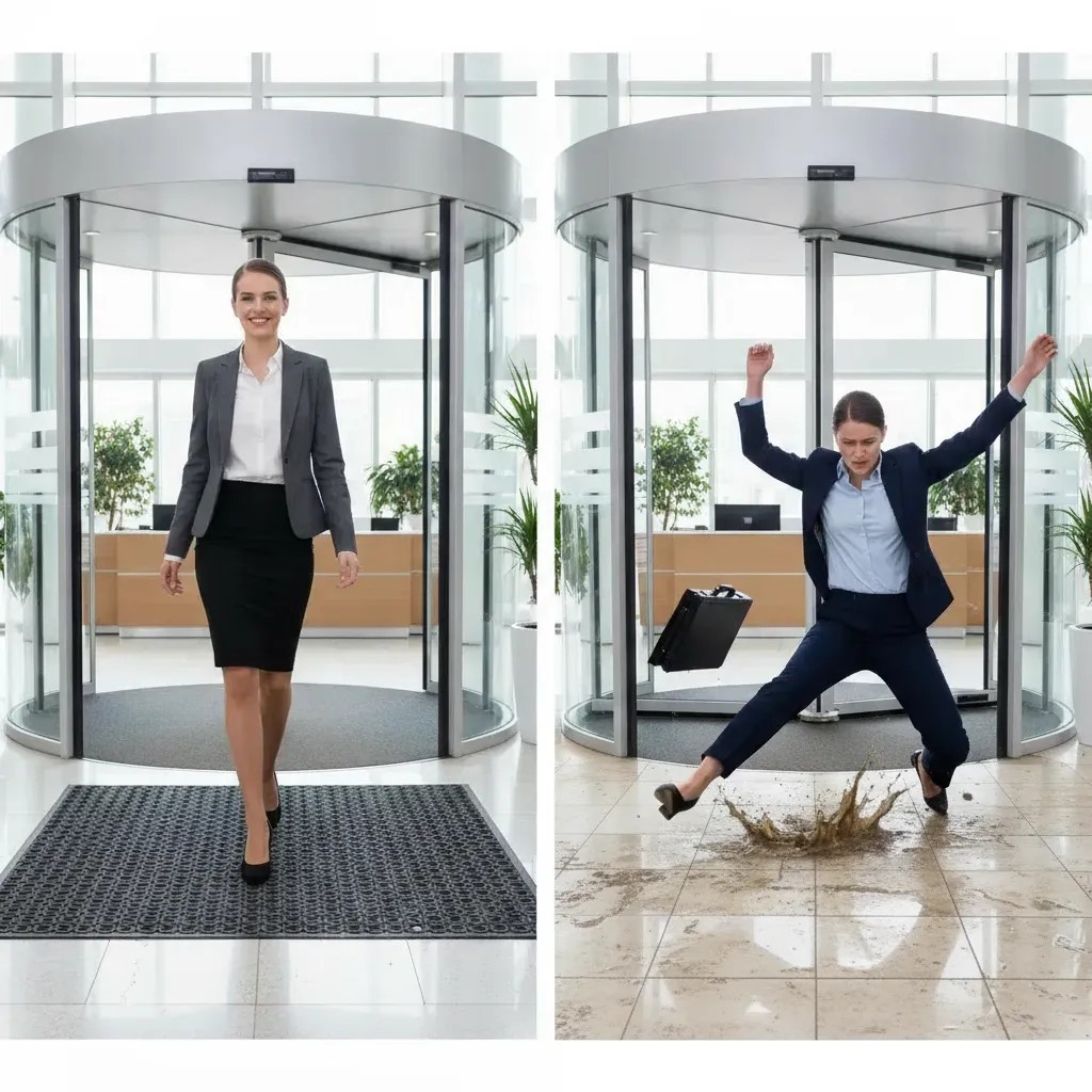 Грязь и влага на обуви создают серьёзные риски как для посетителей, так и для самого напольного покрытия. Вода и тающий снег образуют скользкие участки, которые повышают вероятность поскальзываний и падений; такие инциденты могут приводить к травмам и последующим юридическим претензиям. Химические реагенты, используемые против гололёда, и грязь вызывают обесцвечивание и коррозию поверхностей — паркет, ламинат и ковровые покрытия со временем теряют внешний вид и структуру. Мелкие твёрдые частицы ведут себя как абразив, ускоряя истирание и появление царапин. Кроме того, грязный вход создаёт негативное первое впечатление о помещении и его обслуживании, что повышает вероятность жалоб и снижения посещаемости.